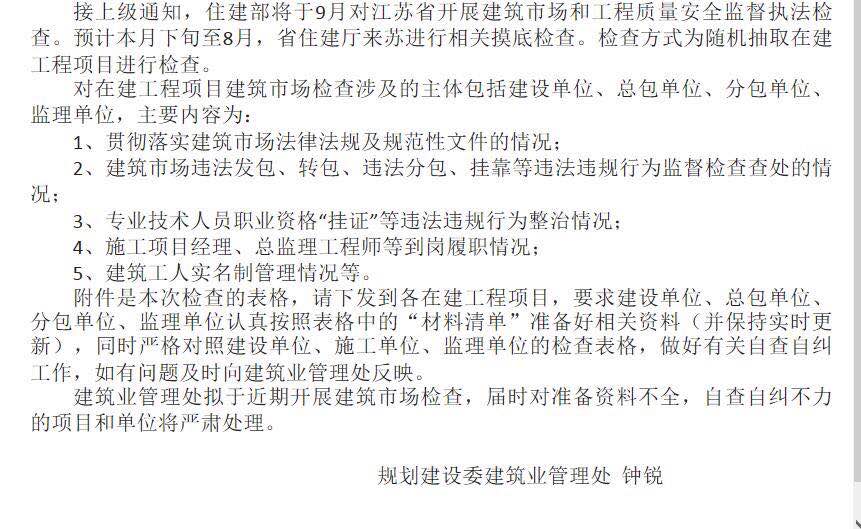 現將《住房和城鄉建設部辦公廳關于組織開展全國建筑市場和工程質量安全監督執法檢查的通知》轉發給你們,請各項目監理部根據文件要求,結合檢查表,做好自查自糾工作,各事業部(直屬部)做好復查工作,公司也將開展相應的抽查工作。